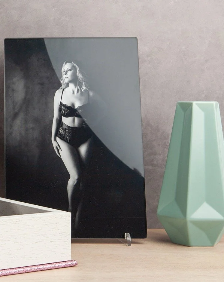 The passepartout is an acrylic piece with a photo printed on metallic paper glued to the back. It comes with two acrylic holders